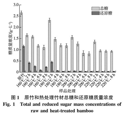 图1 原竹和热处理竹材总糖和还原糖质量浓度