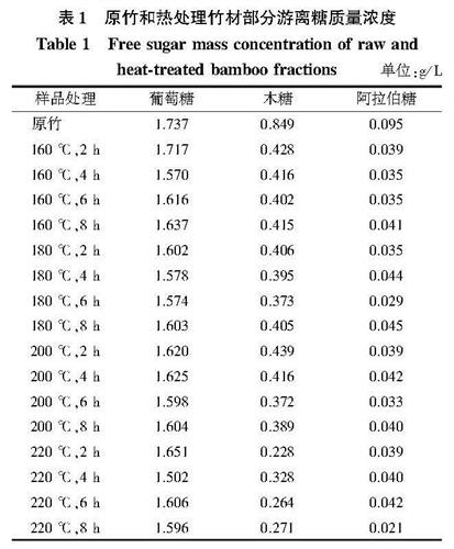 Table 1 Free sugar mass concentration of raw and heat-treated bamboo fractions 单位:g/L