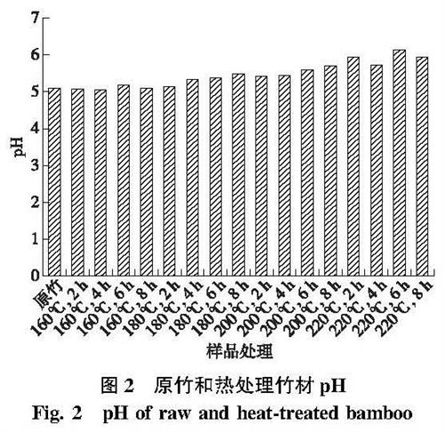 热处理竹材pH的变化趋势见图2。在热处理条件为温度160 ℃,时间2,4,8 h时,竹材的pH略微低于未处理竹材,随着热处理温度和时间的增加,pH总体呈现出逐渐上升的趋势,而且在220 ℃、6 h时pH达到最高值,为6.13。半纤维素在一开始受热的情况下分解生成低聚糖和单糖,然后这类低聚糖和单糖脱下羟基生成有机酸,导致竹材pH降低[12]。随着热处理温度的升高以及时间的延长,降解的糖生成了糖醛酸并发生热降解,导致pH逐渐增加[16]。因此,经过热处理后,竹材的pH仍维持在5.07~6.13区间,呈现出的弱酸性环境仍有利于霉菌的生长。