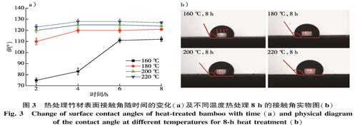 图3 热处理竹材表面接触角随时间的变化(a)及不同温度热处理8 h的接触角实物图(b)