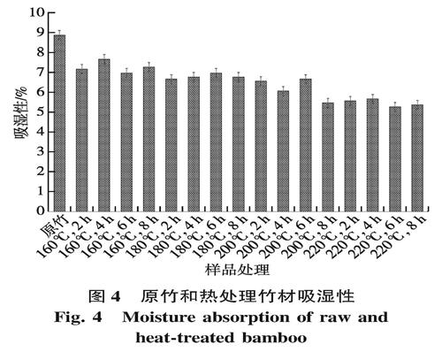 进一步地,热处理竹材的吸湿性呈现明显下降的趋势(图4)。这主要是因为竹材在热处理过程中,半纤维素中自由羟基的数量显著降低,减小了竹材的吸湿性,使竹材与外界水分的交换能力下降,同时,半纤维素中的某些多糖易裂解为糖醛和部分糖类产物,在加热作用下,这些物质又能聚合生成不溶于水的聚合物,从而显著降低竹材的吸湿性[22]。