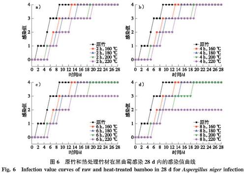 黑曲霉在原竹和热处理竹材上的霉变情况及其感染值曲线分别如图5和图6所示。由图5和图6可知,原竹在第2天就开始感染,在第9天时黑曲霉感染面积占比迅速超过了75%,感染等级达到最高等级4级,而经过28 d的霉变测试,原竹表面完全被黑曲霉感染,证实了原竹容易霉变的特点。值得注意的是,所有热处理竹材在第5天才开始出现菌丝,说明经过热处理后竹材总糖和还原糖的降低以及润湿性的下降,在一定程度上抑制了霉菌的生长; 同时,随着热处理温度和时间的增加,黑曲霉的霉变速率逐渐变缓。但经过4周的霉变测试后,在160,180,200 ℃下处理的所有竹材样品的感染面积占比均超过了75%,霉变等级为4,表明竹材中残留的糖分仍然为霉菌生长提供了充足的营养。尽管在220 ℃热处理条件下竹材的霉变速率进一步放缓,但是在热处理8 h时竹材的霉菌感染面积占比仍然接近50%,感染等级为2级。进一步地,根据热处理竹材与原竹的霉菌感染面积占比,计算出热处理竹材的黑曲霉防治效力,结果显示,除了220 ℃处理6和8 h时防治效力分别为16.7%和50.0%,其他热处理竹材样品的防治效力均为0。上述事实表明,尽管热处理后竹材的吸湿性得到一定的改善,但是其中残留的糖分以及适宜的pH仍然为黑曲霉的生长提供了充分的条件,因此,通过高温热处理并不能明显改善竹材的防霉效果。